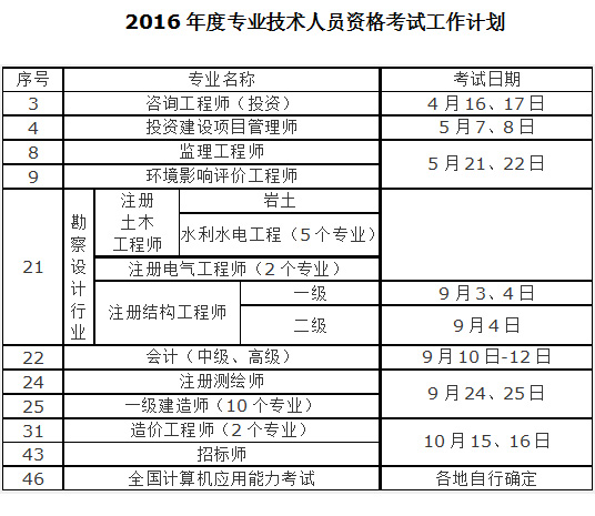 一、請按照《2016年度專業(yè)技術(shù)人員資格考試工作計劃》(見附件),做好考試組織實施工作,確保各項考試工作安全順利進行。如遇特殊情況需要變更考試日期的,將提前另行通知。未列入該年度考試工作計劃的其他專業(yè)的考試日期,待確定后另行通知。