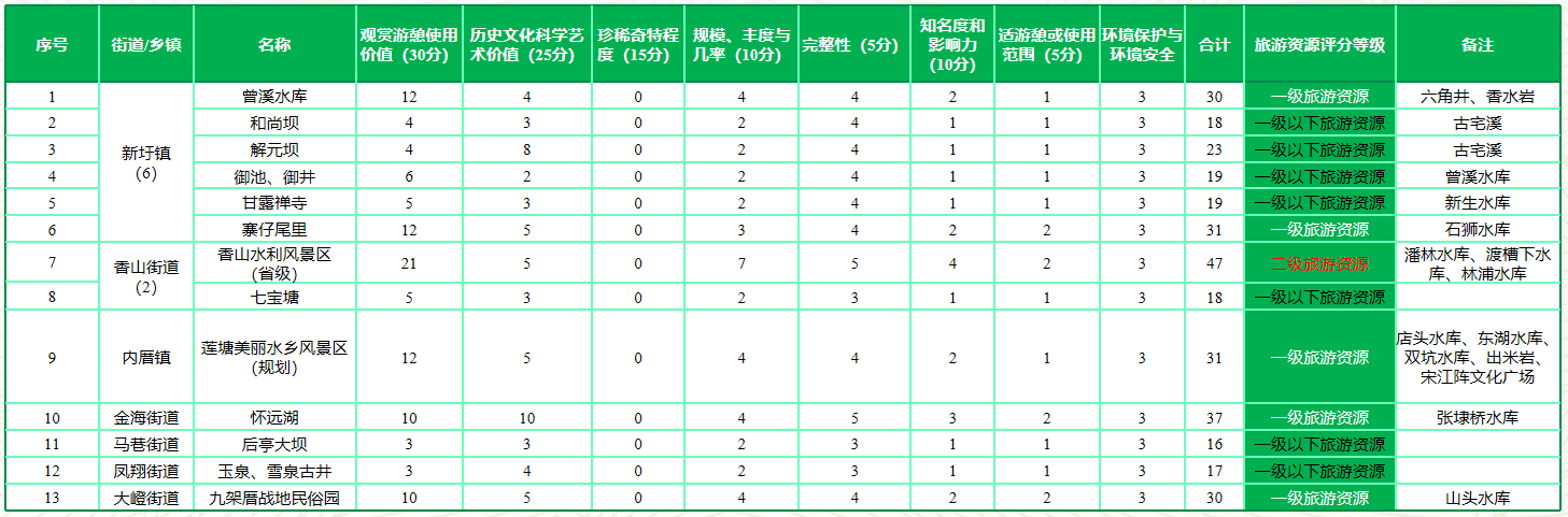 (水旅資源單體評(píng)價(jià)賦分成果表)